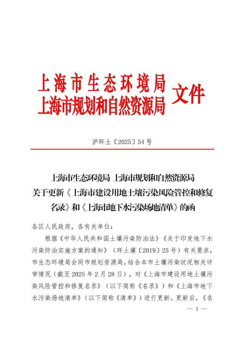 根据《中华人民共和国土壤污染防治法》《关于印发地下水污染防治实施方案的通知》(环土壤〔2019〕25号)有关要求,市生态环境局会同市规划资源局,结合本市土壤污染状况相关评审情况(截至2025年2月28日),对《上海市建设用地土壤污染风险管控和修复名录》(以下简称《名录》)和《上海市地下水污染场地清单》(以下简称《清单》)进行更新。更新后,《名录》共有42个地块(附件1、2);《清单》共有27个地块(附件3、4)。现将上述《名录》和《清单》印发给你们。
