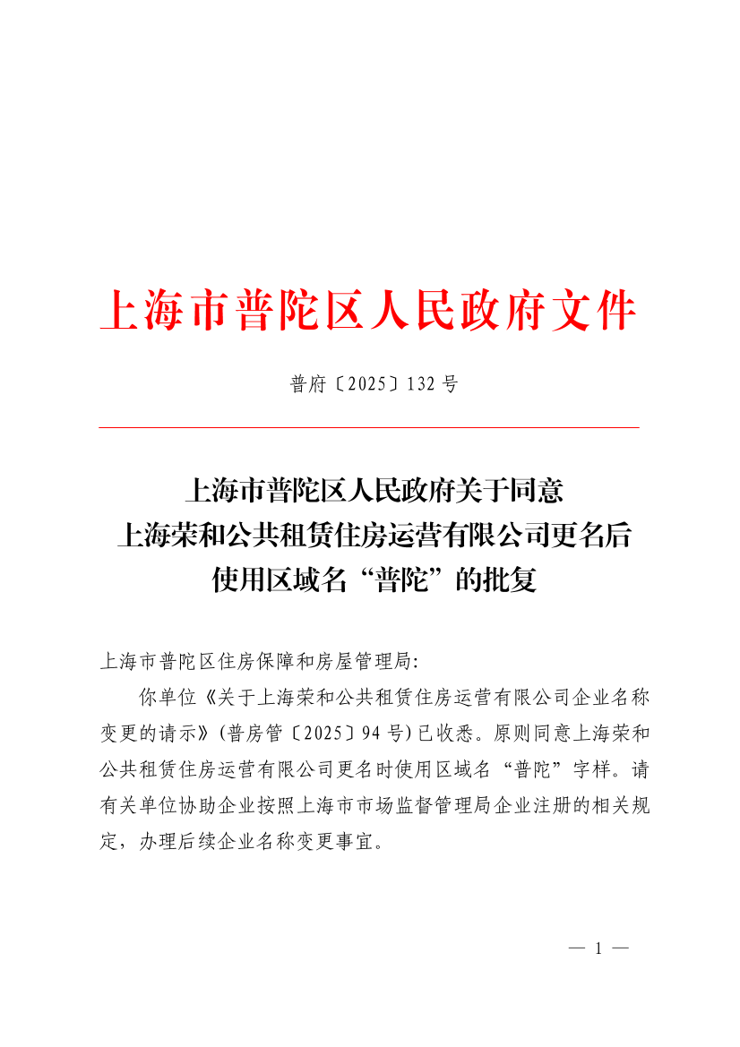 你单位《关于上海荣和公共租赁住房运营有限公司企业名称变更的请示》(普房管〔2025〕94号)已收悉。原则同意上海荣和公共租赁住房运营有限公司更名时使用区域名“普陀”字样。请有关单位协助企业按照上海市市场监督管理局企业注册的相关规定,办理后续企业名称变更事宜。