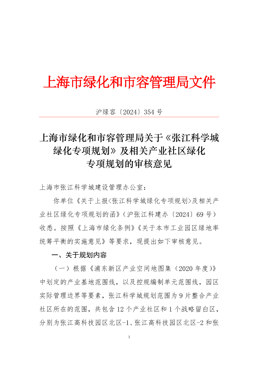你单位《关于上报<张江科学城绿化专项规划>及相关产业社区绿化专项规划的函》(沪张江科建办〔2024〕69号)收悉。按照《上海市绿化条例》《关于本市工业园区绿地率统筹平衡的实施意见》等要求,现提出如下审核意见。