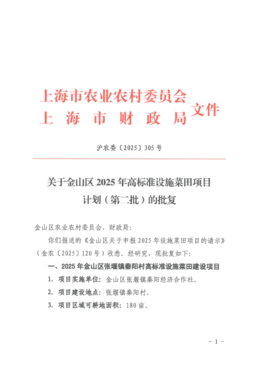 一、2025年金山区张堰镇秦阳村高标准设施菜田建设项目