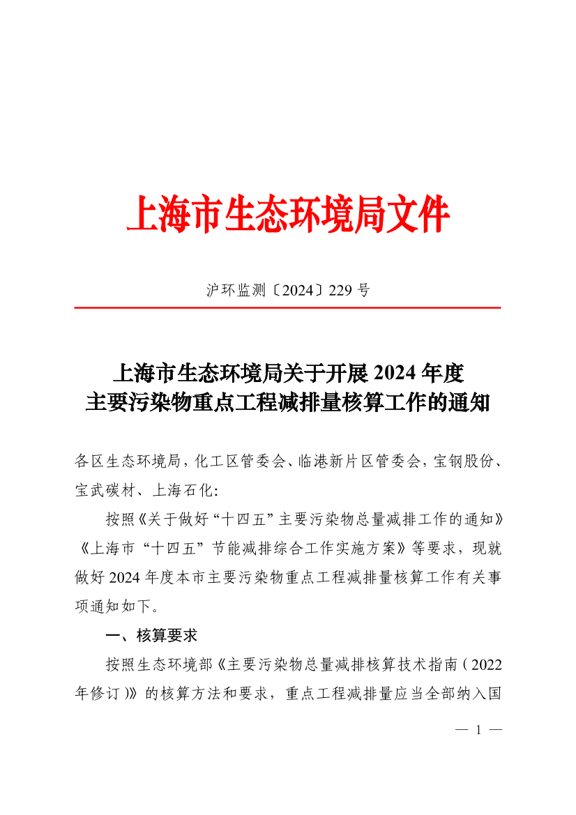 按照《关于做好“十四五”主要污染物总量减排工作的通知》《上海市“十四五”节能减排综合工作实施方案》等要求,现就做好2024年度本市主要污染物重点工程减排量核算工作有关事项通知如下。