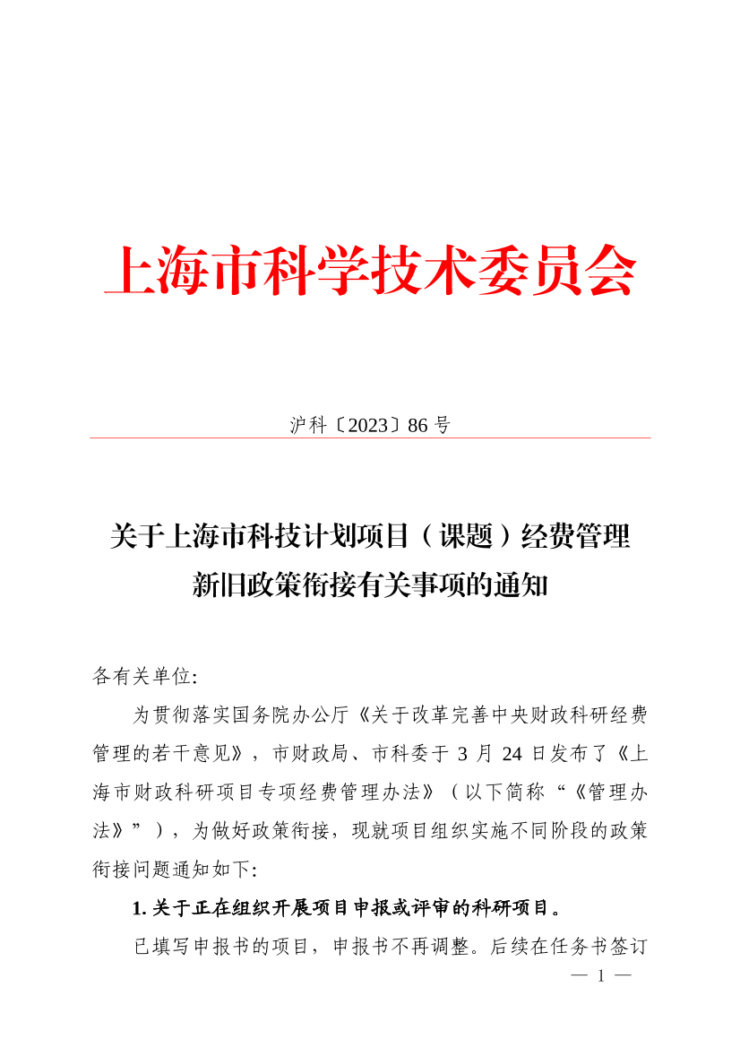 为贯彻落实国务院办公厅《关于改革完善中央财政科研经费管理的若干意见》,市财政局、市科委于3月24日发布了《上海市财政科研项目专项经费管理办法》(以下简称“《管理办法》”),为做好政策衔接,现就项目组织实施不同阶段的政策衔接问题通知如下: