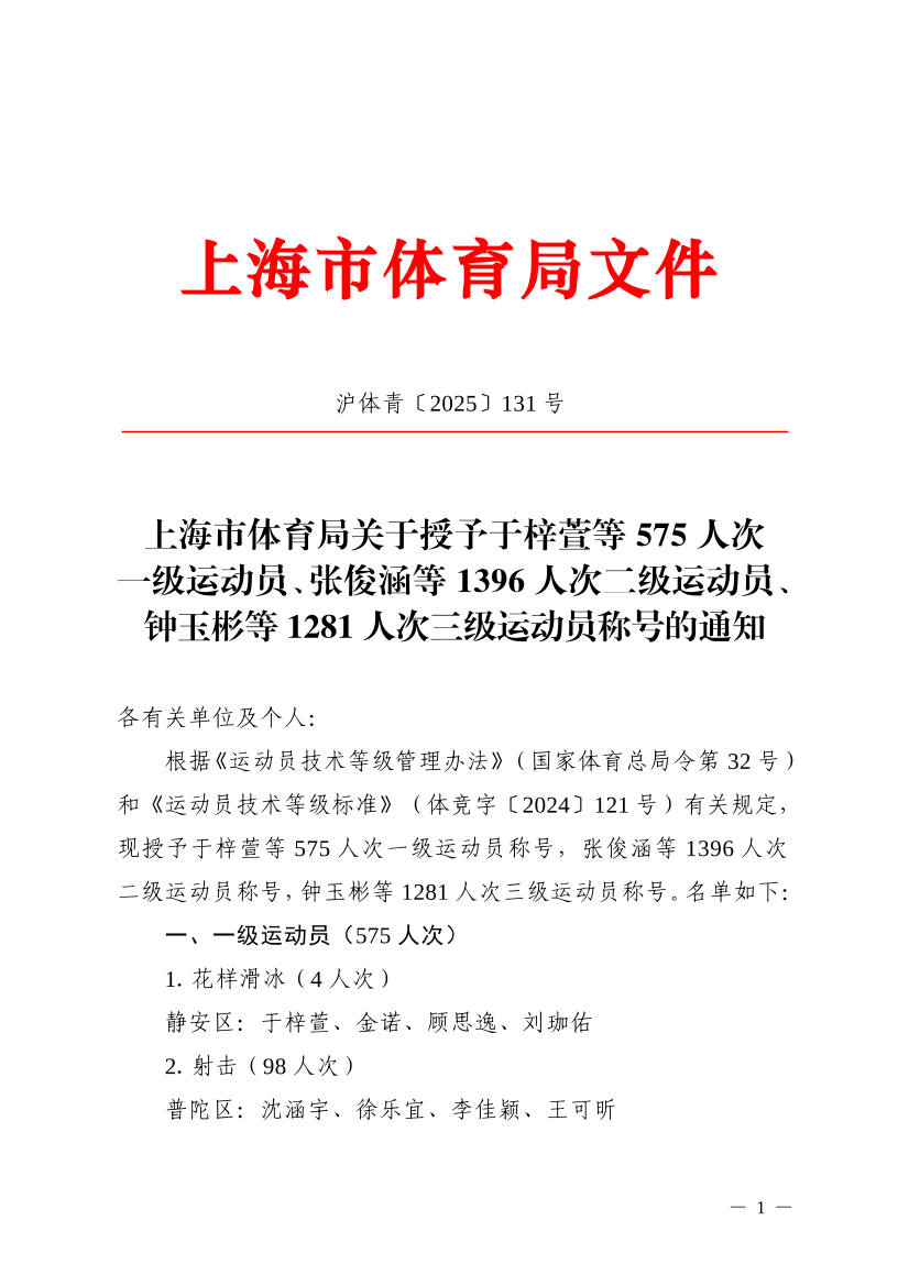 根据《运动员技术等级管理办法》(国家体育总局令第32号)和《运动员技术等级标准》(体竞字〔2024〕121号)有关规定,现授予于梓萱等575人次一级运动员称号,张俊涵等1396人次二级运动员称号,钟玉彬等1281人次三级运动员称号。名单如下: