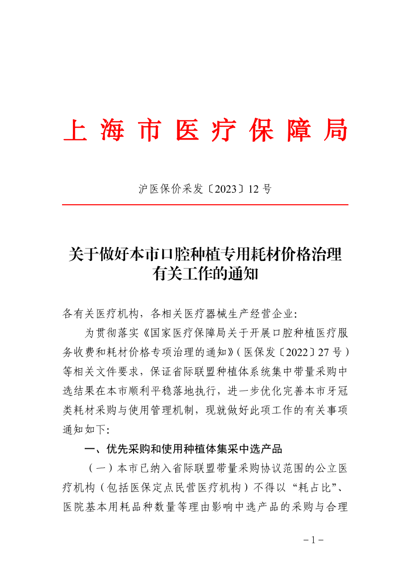 为贯彻落实《国家医疗保障局关于开展口腔种植医疗服务收费和耗材价格专项治理的通知》(医保发〔2022〕27号)等相关文件要求,保证省际联盟种植体系统集中带量采购中选结果在本市顺利平稳落地执行,进一步优化完善本市牙冠类耗材采购与使用管理机制,现就做好此项工作的有关事项通知如下: