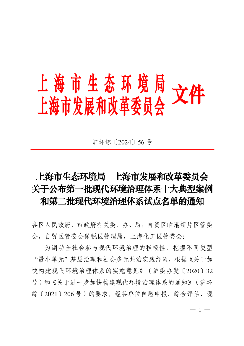 为调动全社会参与现代环境治理的积极性,挖掘不同类型“最小单元”基层治理和社会多元共治实践经验,根据《关于加快构建现代环境治理体系的实施意见》(沪委办发〔2020〕32号)和《关于进一步加快构建现代环境治理体系的通知》(沪环综〔2021〕206号)的要求,经各单位自愿申报、综合评估、现场审核和专家评审,择优选取了10个实施效果好、示范效应显著的典型案例,以及32家基础较好、具备明确特色创新方向的试点名单,现予以公布,有关工作通知如下。