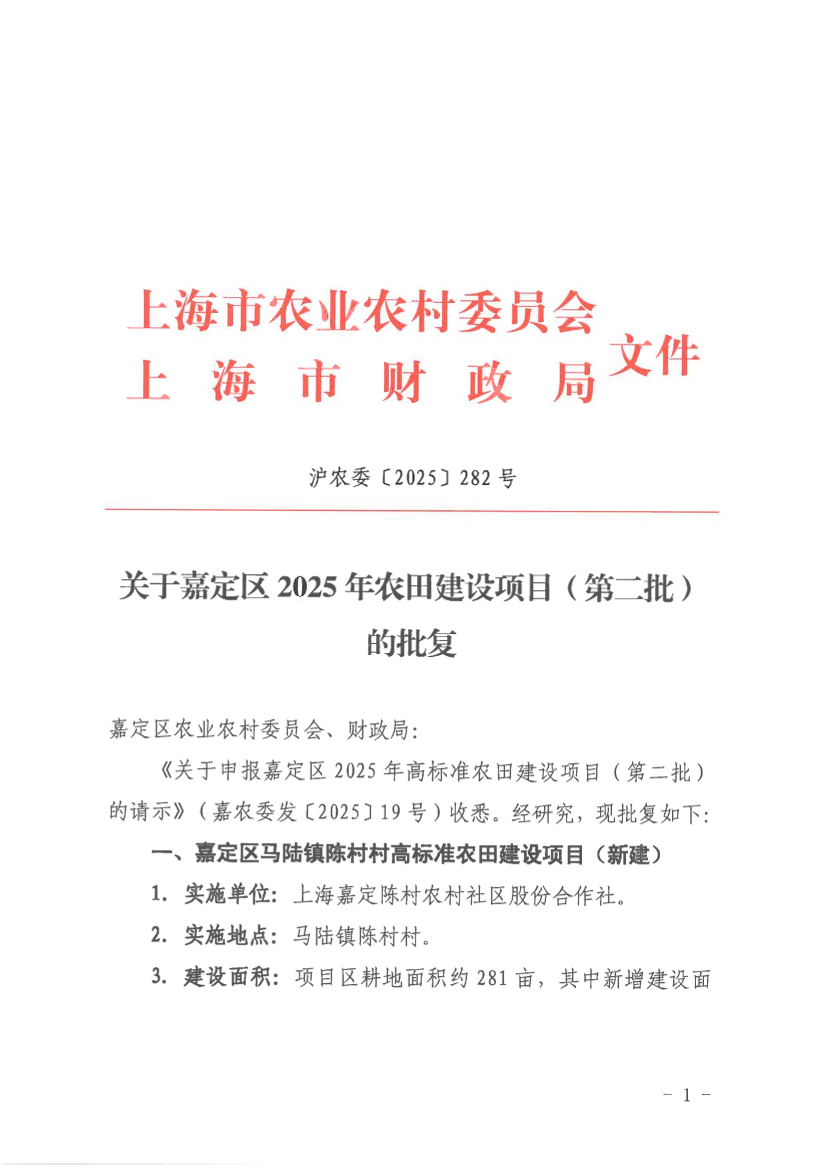 《关于申报嘉定区2025年高标准农田建设项目(第二批)的请示》(嘉农委发〔2025〕19号)收悉。经研究,现批复如下:
