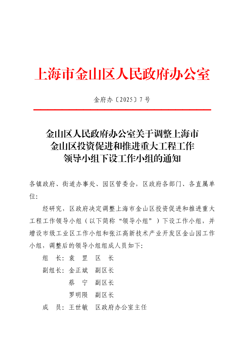 经研究,区政府决定调整上海市金山区投资促进和推进重大工程工作领导小组(以下简称“领导小组”)下设工作小组,并增设市级工业区工作小组和张江高新技术产业开发区金山园工作小组,调整后的领导小组组成人员如下: