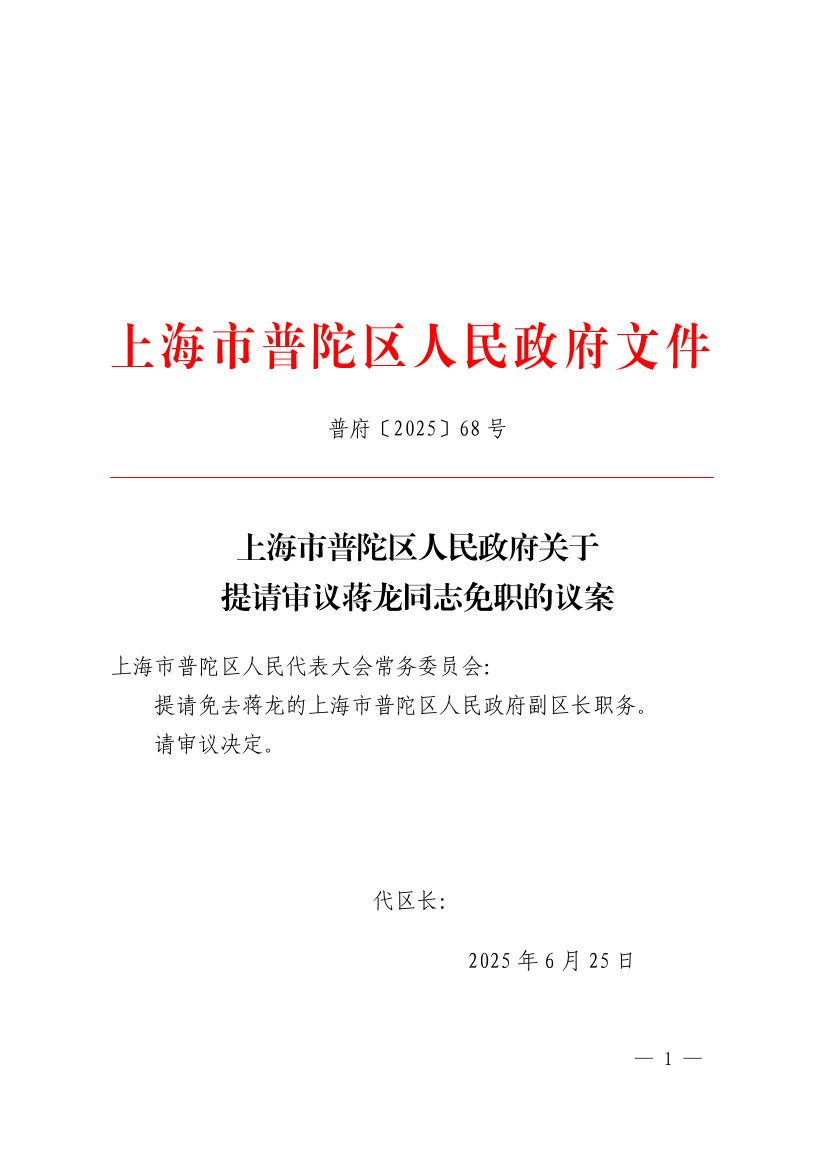 提请免去蒋龙的上海市普陀区人民政府副区长职务。