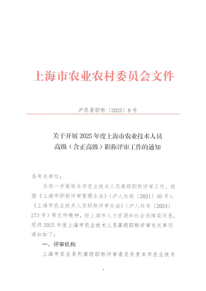 为进一步做好本市农业技术人员高级职称评审工作,根据《上海市职称评审管理办法》(沪人社规〔2021〕30号)、《上海市农业技术人员职称评审办法》(沪人社专〔2024〕273号)等文件精神,经上海市人力资源和社会保障局同意,现将2025年度上海市农业技术人员高级职称评审有关事项通知如下: