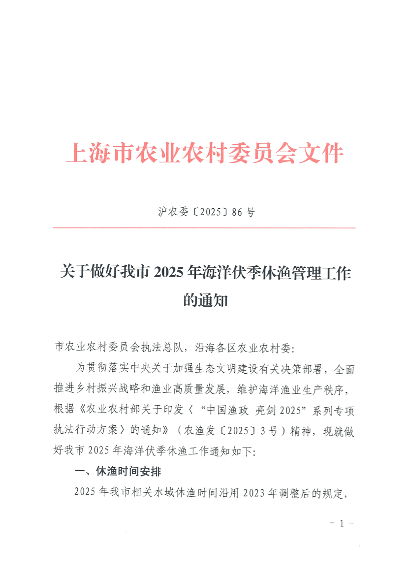 2025年我市相关水域休渔时间沿用2023年调整后的规定,根据《关于调整本市海洋伏季休渔制度的通告》(沪农委规〔2023〕5号),具体如下: