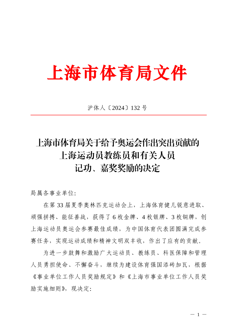为进一步鼓舞和激励广大运动员、教练员、科医保障和管理人员勇担使命、不懈奋斗,继续为建设体育强国添砖加瓦,根据《事业单位工作人员奖励规定》和《上海市事业单位工作人员奖励实施细则》,现决定: