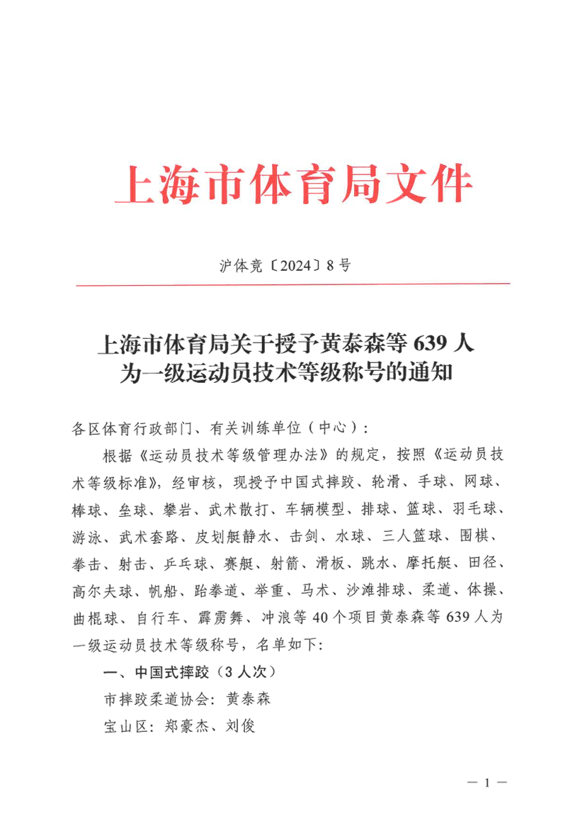 根据《运动员技术等级管理办法》的规定,按照《运动员技术等级标准》,经审核,现授予中国式摔跤、轮滑、手球、网球、棒球、垒球、攀岩、武术散打、车辆模型、排球、篮球、羽毛球、游泳、武术套路、皮划艇静水、击剑、水球、三人篮球、围棋、拳击、射击、乒乓球、赛艇、射箭、滑板、跳水、摩托艇、田径、高尔夫球、帆船、跆拳道、举重、马术、沙滩排球、柔道、体操、曲棍球、自行车、霹雳舞、冲浪等40个项目黄泰森等639人为一级运动员技术等级称号,名单如下: