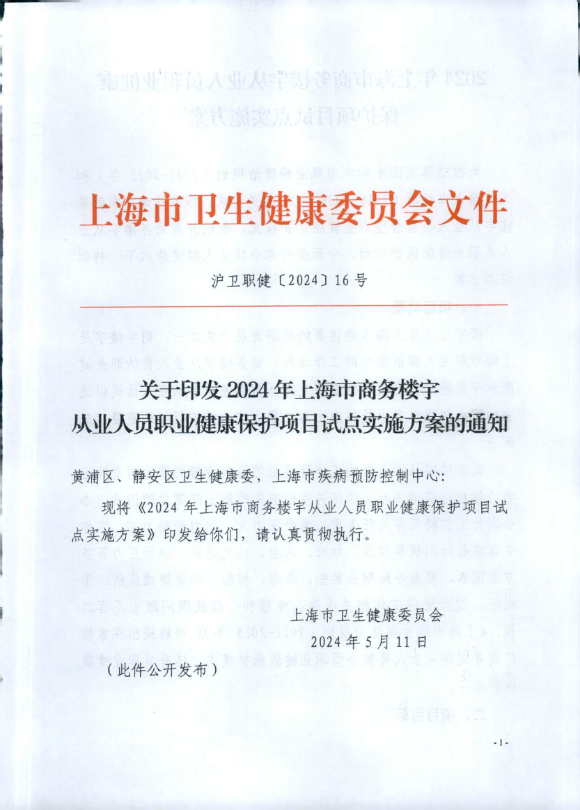 现将《2024年上海市商务楼宇从业人员职业健康保护项目试点实施方案》印发给你们,请认真贯彻执行。