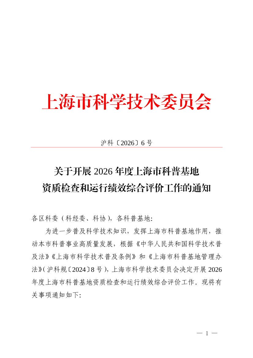 为进一步普及科学技术知识,发挥上海市科普基地作用,推动本市科普事业高质量发展,根据《中华人民共和国科学技术普及法》《上海市科学技术普及条例》和《上海市科普基地管理办法》(沪科规〔2024〕8号),上海市科学技术委员会决定开展2026年度上海市科普基地资质检查和运行绩效综合评价工作。现将有关事项通知如下: