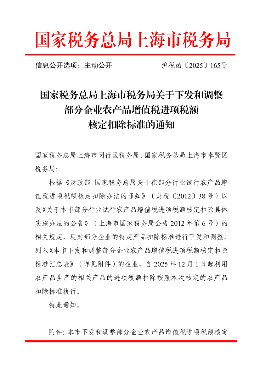 根据《财政部 国家税务总局关于在部分行业试行农产品增值税进项税额核定扣除办法的通知》(财税〔2012〕38号)以及《关于本市部分行业试行农产品增值税进项税额核定扣除具体实施办法的公告》(上海市国家税务局公告2012年第6号)的相关规定,现对部分企业的特定产品扣除标准进行下发和调整,列入《本市下发和调整部分企业农产品增值税进项税额核定扣除标准汇总表》(详见附件)的企业,自2025年12月1日起利用农产品生产的相关产品的进项税额扣除按照本次核定的农产品扣除标准执行。