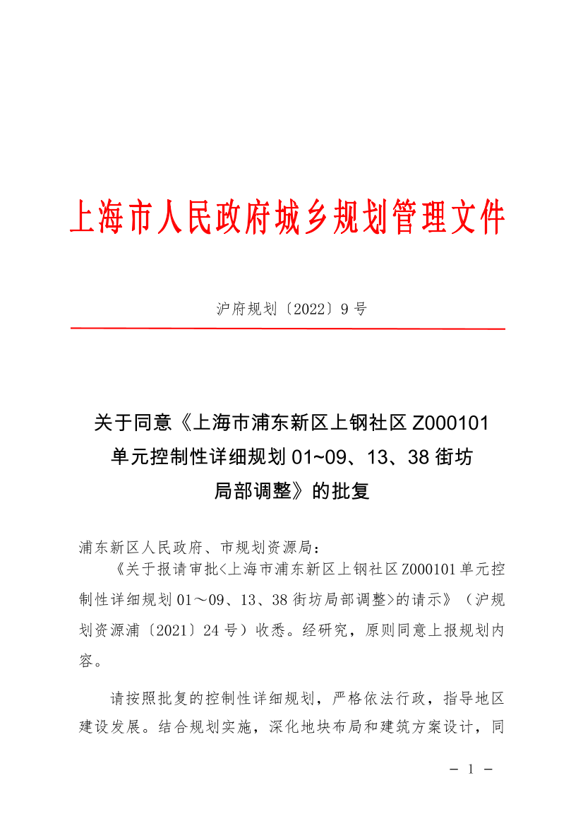 《关于报请审批<上海市浦东新区上钢社区Z000101单元控制性详细规划01~09、13、38街坊局部调整>的请示》(沪规划资源浦〔2021〕24号)收悉。经研究,原则同意上报规划内容。