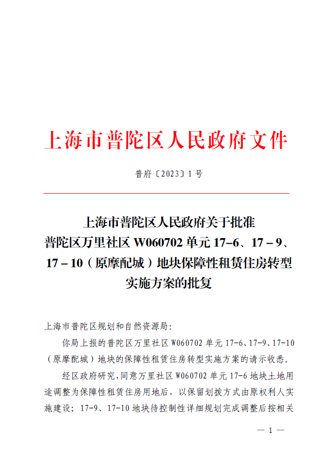 你局上报的普陀区万里社区W060702单元17-6、17-9、17-10(原摩配城)地块的保障性租赁住房转型实施方案的请示收悉。
