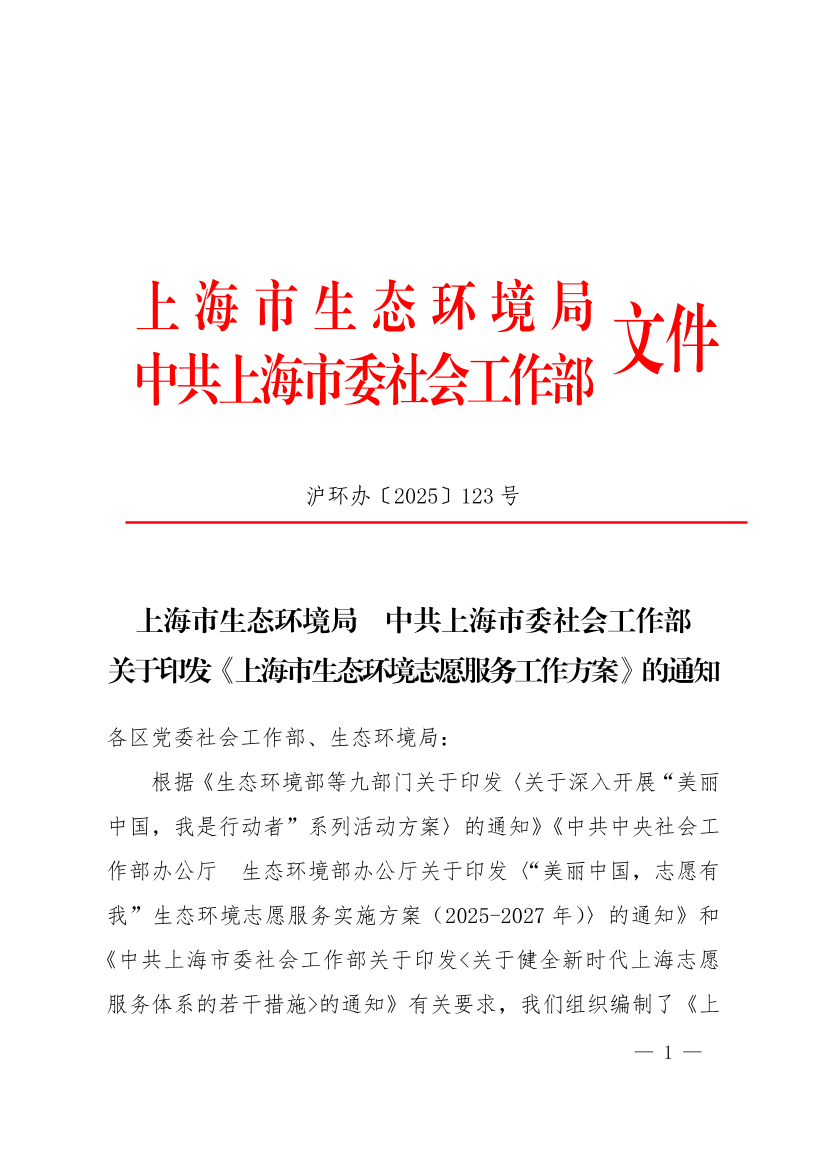 根据《生态环境部等九部门关于印发〈关于深入开展“美丽中国,我是行动者”系列活动方案〉的通知》《中共中央社会工作部办公厅 生态环境部办公厅关于印发〈“美丽中国,志愿有我”生态环境志愿服务实施方案(2025-2027年)〉的通知》和《中共上海市委社会工作部关于印发<关于健全新时代上海志愿服务体系的若干措施>的通知》有关要求,我们组织编制了《上海市生态环境志愿服务工作方案》,现予印发,请认真贯彻执行。
