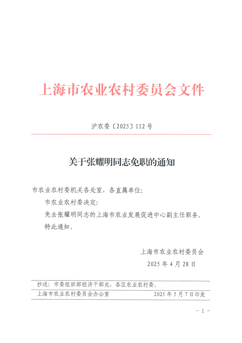 免去张耀明同志的上海市农业发展促进中心副主任职务。
