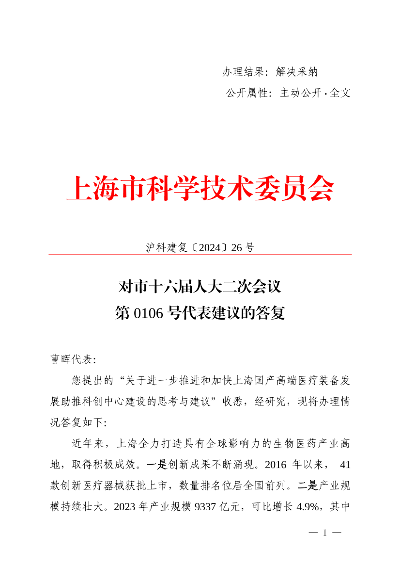 曹晖代表提出的支持国产自主品牌高端医疗装备、协同攻关“卡脖子”技术、助力上海国产自主品牌参与国际大循环、加快地产医疗装备应用推广等建议对进一步促进本市医疗装备产业高质量发展,具有重要意义。我们将继续加快促进高端医疗装备产业的发展,助力打造世界级生物医药产业集群。