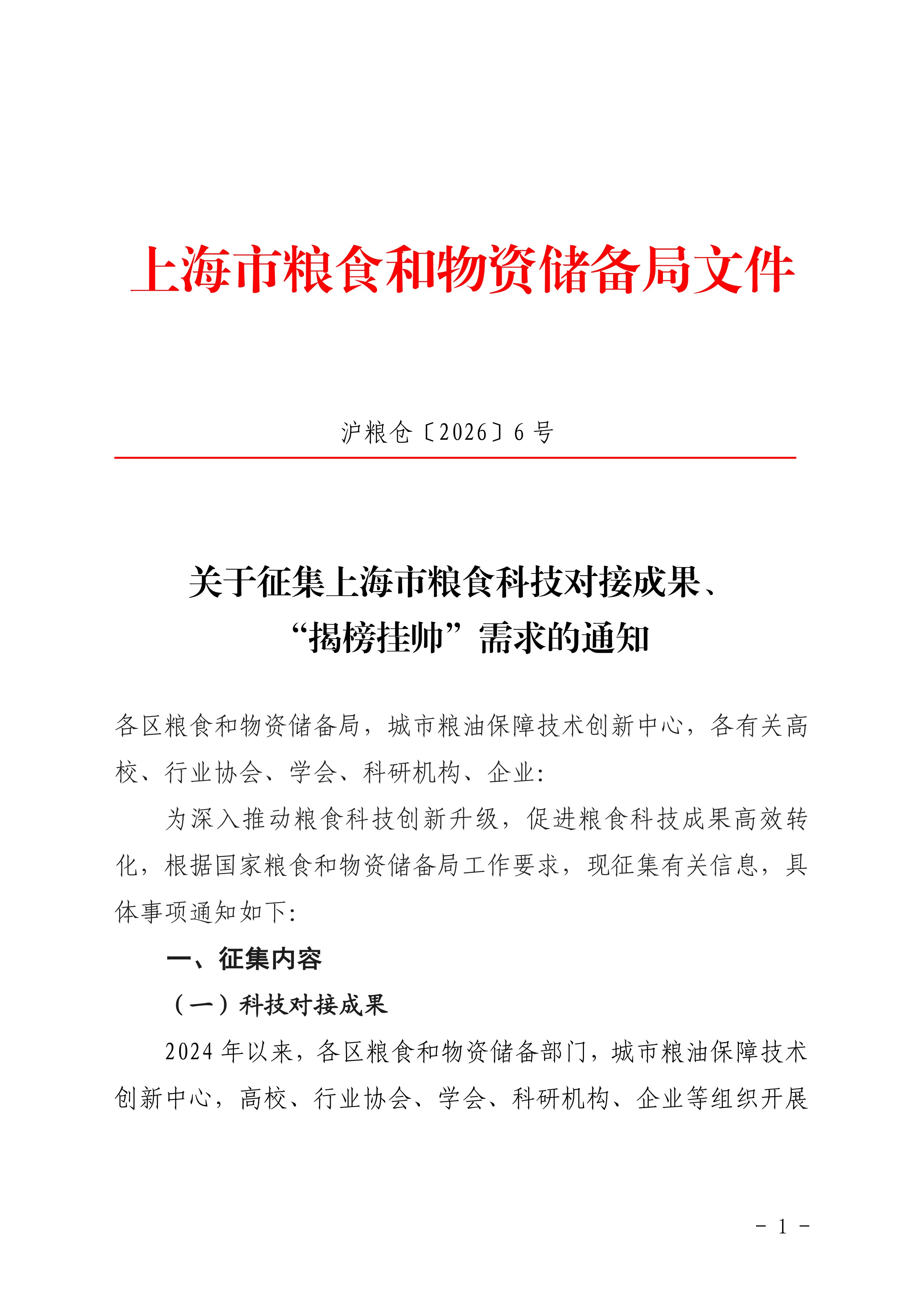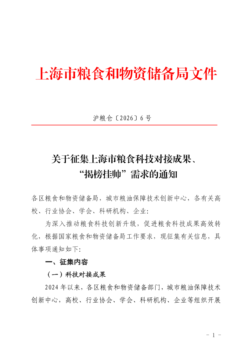 请各有关单位即日起填报《科技成果对接信息表》《揭榜挂帅需求表》(见附件),加盖单位公章的表格于2026年2月25日(周三)前邮寄上海市粮食和物资储备局。同时,信息表、需求表电子版以(“单位名称”+“表名称”命名)按照上述时间节点发至指定邮箱。