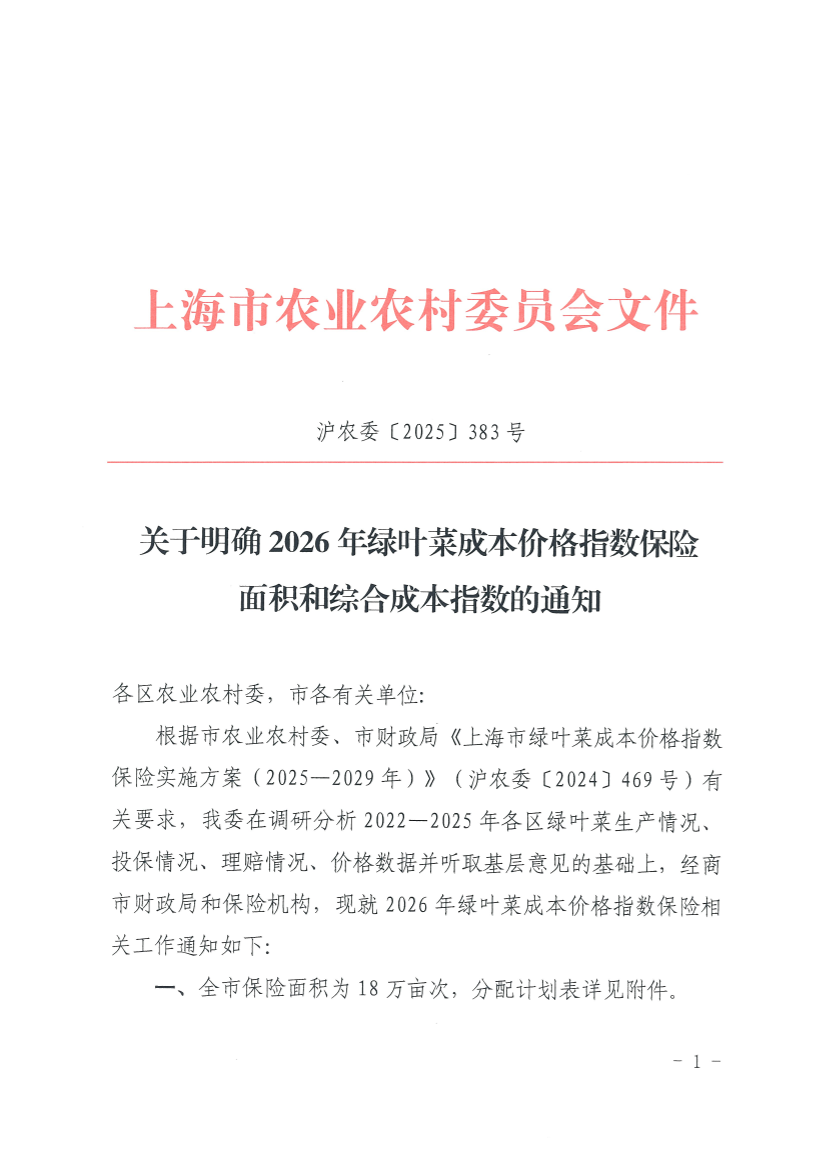 根据市农业农村委、市财政局《上海市绿叶菜成本价格指数保险实施方案(2025—2029年)》(沪农委〔2024〕469号)有关要求,我委在调研分析2022—2025年各区绿叶菜生产情况、投保情况、理赔情况、价格数据并听取基层意见的基础上,经商市财政局和保险机构,现就2026年绿叶菜成本价格指数保险相关工作通知如下: