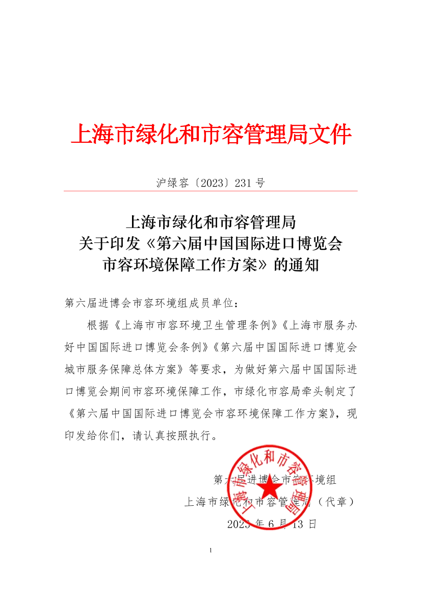 根据《上海市市容环境卫生管理条例》《上海市服务办好中国国际进口博览会条例》《第六届中国国际进口博览会城市服务保障总体方案》等要求,为做好第六届中国国际进口博览会期间市容环境保障工作,市绿化市容局牵头制定了《第六届中国国际进口博览会市容环境保障工作方案》,现印发给你们,请认真按照执行。