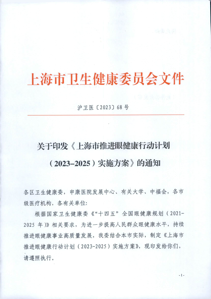 根据国家卫生健康委《“十四五”全国眼健康规划(2021-2025年)》相关要求,为进一步提高人民群众眼健康水平,持续推进眼健康事业高质量发展,我委结合本市实际,制定《上海市推进眼健康行动计划(2023-2025)实施方案》,现印发给你们,请遵照执行。