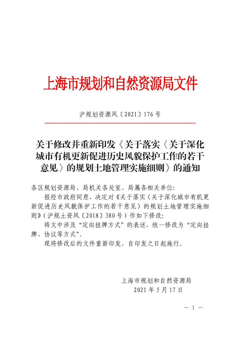 报经市政府同意,决定对《关于落实〈关于深化城市有机更新促进历史风貌保护工作的若干意见〉的规划土地管理实施细则》(沪规土资风〔2018〕380号)作如下修改: