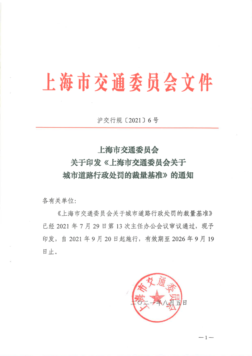 《上海市交通委员会关于城市道路行政处罚的裁量基准》已经2021年7月29日第13次主任办公会议审议通过,现予印发,自2021年9月20日起施行,有效期至2026年9月19日止。