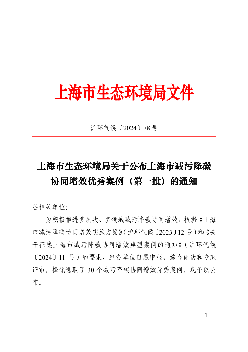 为积极推进多层次、多领域减污降碳协同增效,根据《上海市减污降碳协同增效实施方案》(沪环气候〔2023〕12号)和《关于征集上海市减污降碳协同增效典型案例的通知》(沪环气候〔2024〕11号)的要求,经各单位自愿申报、综合评估和专家评审,择优选取了30个减污降碳协同增效优秀案例,现予以公布。