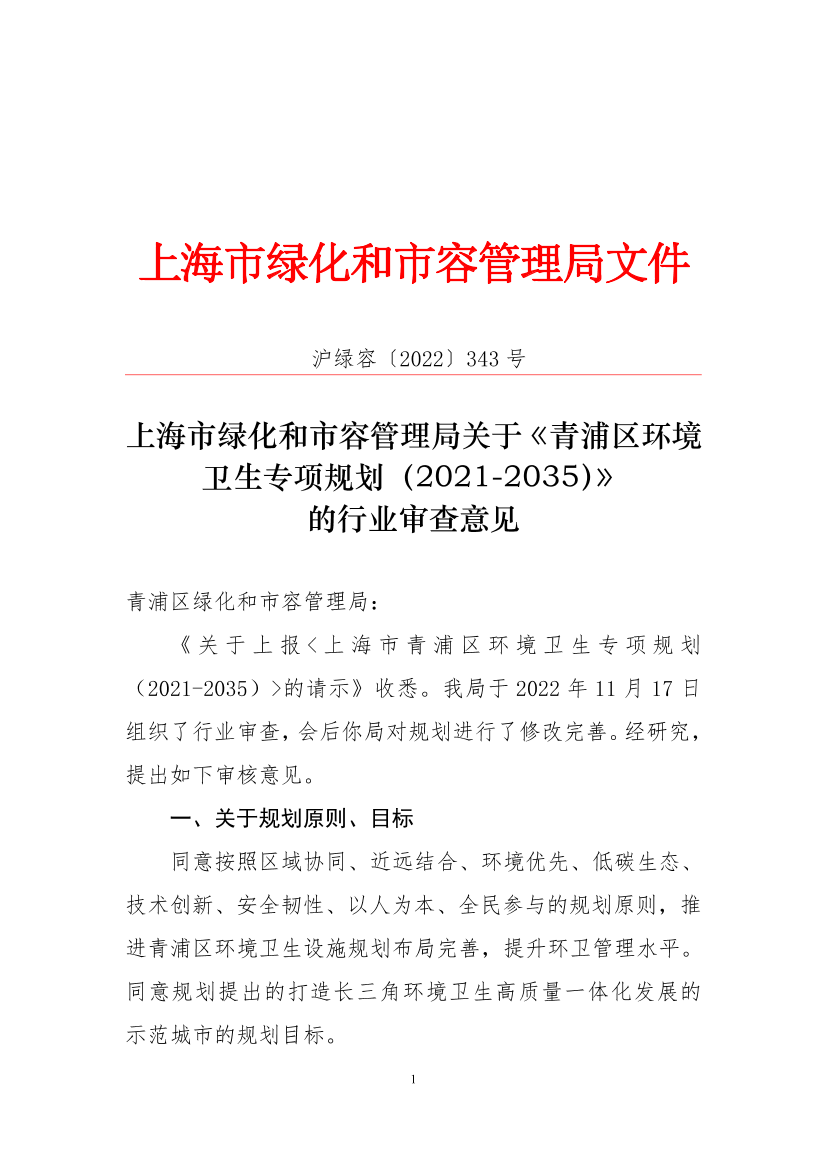 《关于上报<上海市青浦区环境卫生专项规划(2021-2035)>的请示》收悉。我局于2022年11月17日组织了行业审查,会后你局对规划进行了修改完善。经研究,提出如下审核意见。