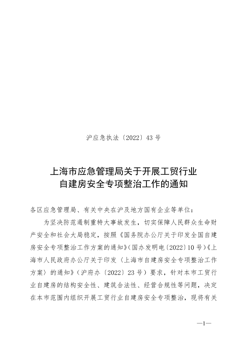为坚决防范遏制重特大事故发生,切实保障人民群众生命财产安全和社会大局稳定,按照《国务院办公厅关于印发全国自建房安全专项整治工作方案的通知》(国办发明电〔2022〕10号)《上海市人民政府办公厅关于印发〈上海市自建房安全专项整治工作方案〉的通知》(沪府办〔2022〕23号)要求,针对本市工贸行业自建房的结构安全性、建筑合法性、经营合规性等问题,决定在本市范围内组织开展工贸行业自建房安全专项整治,现将有关事项通知如下。