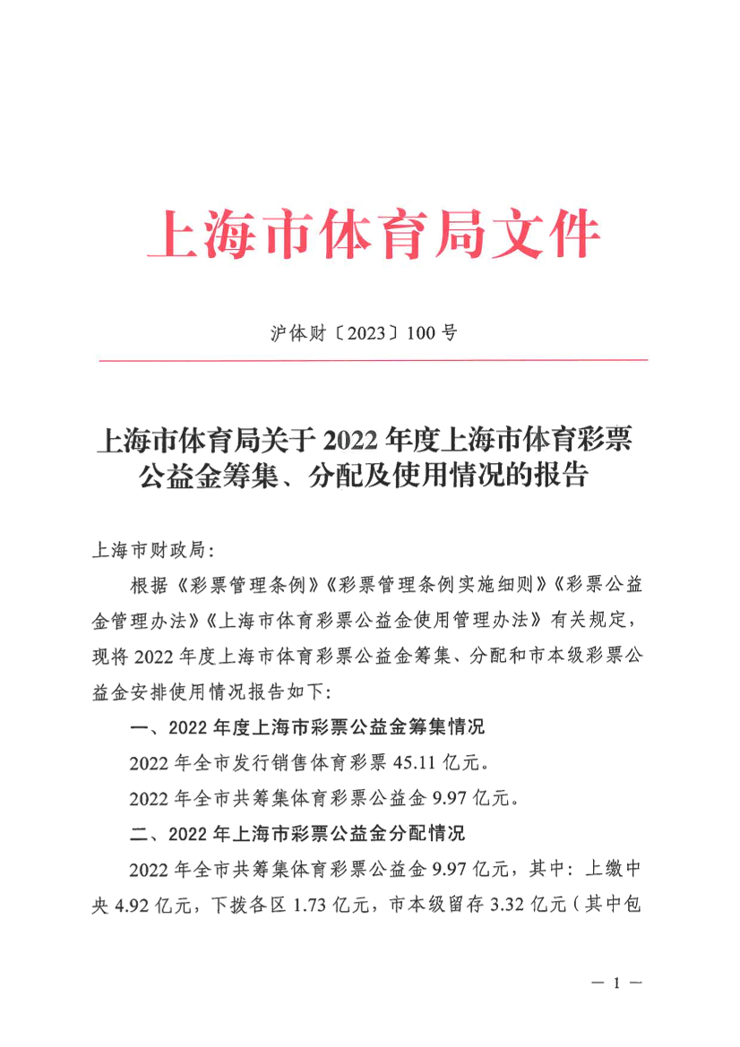 根据《彩票管理条例》《彩票管理条例实施细则》《彩票公益金管理办法》《上海市体育彩票公益金使用管理办法》有关规定,现将2022年度上海市体育彩票公益金筹集、分配和市本级彩票公益金安排使用情况报告如下:
