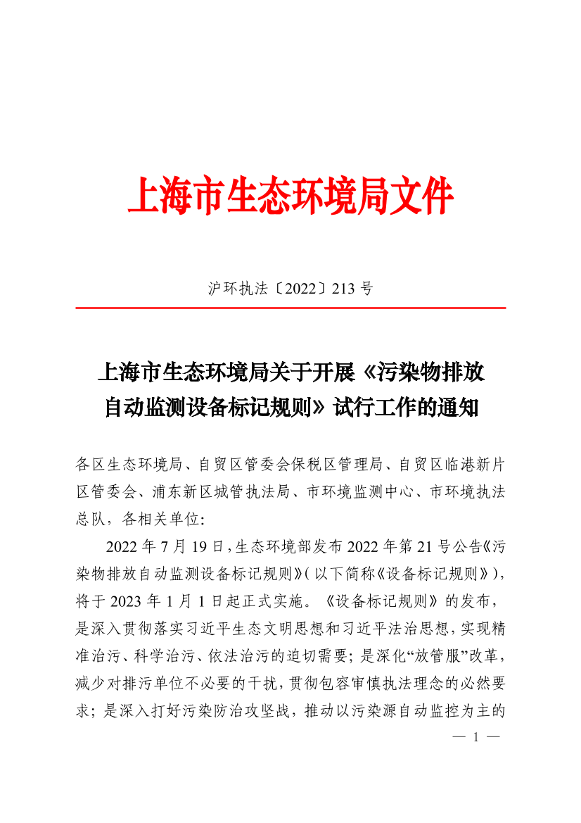 2022年7月19日,生态环境部发布2022年第21号公告《污染物排放自动监测设备标记规则》(以下简称《设备标记规则》),将于2023年1月1日起正式实施。《设备标记规则》的发布,是深入贯彻落实习近平生态文明思想和习近平法治思想,实现精准治污、科学治污、依法治污的迫切需要;是深化“放管服”改革,减少对排污单位不必要的干扰,贯彻包容审慎执法理念的必然要求;是深入打好污染防治攻坚战,推动以污染源自动监控为主的非现场监管手段,提高执法效能的必然要求。根据生态环境部《关于做好污染物排放自动监测设备标记规则相关工作的通知》(环办执法函〔2022〕373号)要求,本市将开展《设备标记规则》试行工作,现将有关要求通知如下: