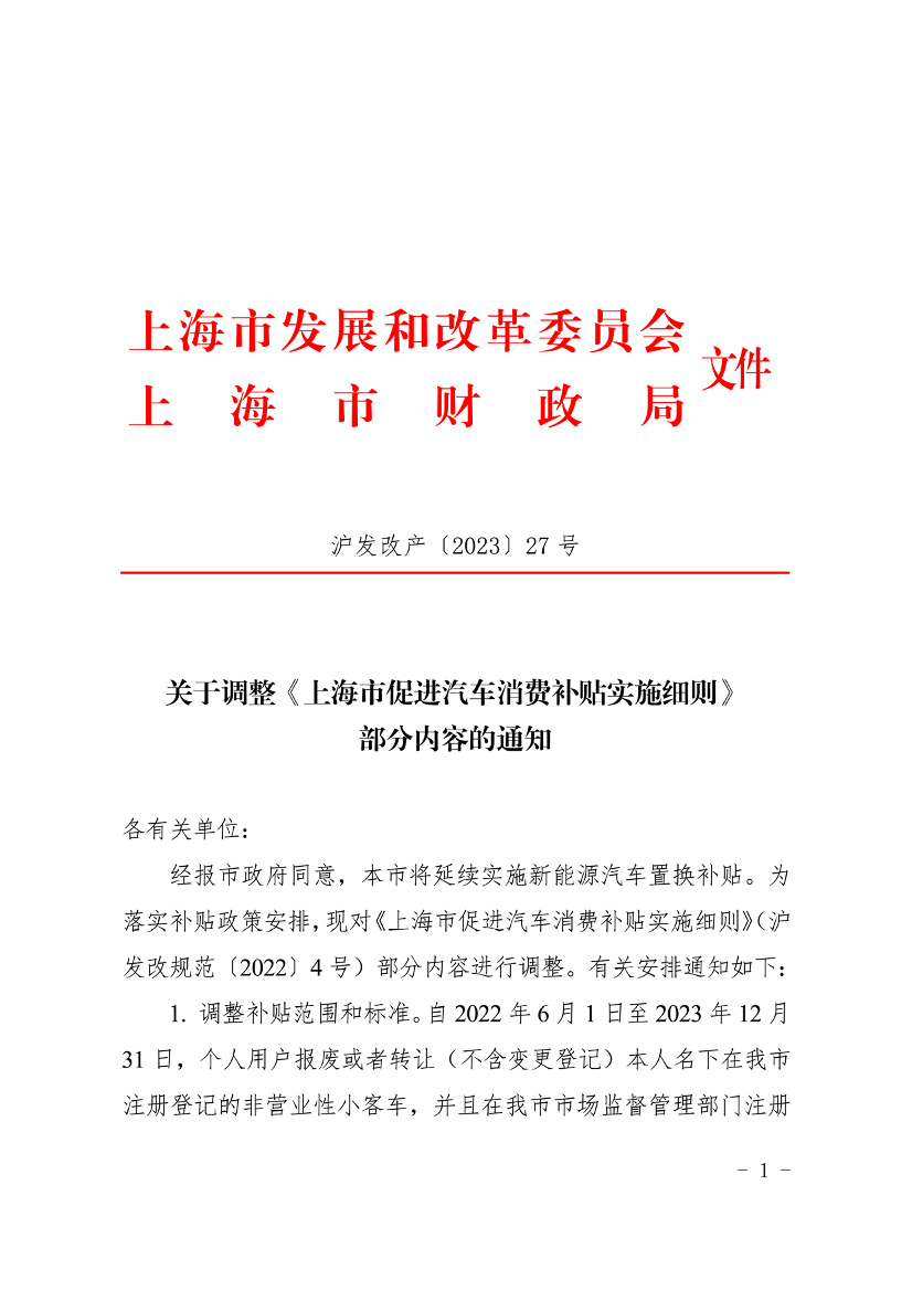 经报市政府同意,本市将延续实施新能源汽车置换补贴。为落实补贴政策安排,现对《上海市促进汽车消费补贴实施细则》(沪发改规范〔2022〕4号)部分内容进行调整。有关安排通知如下: