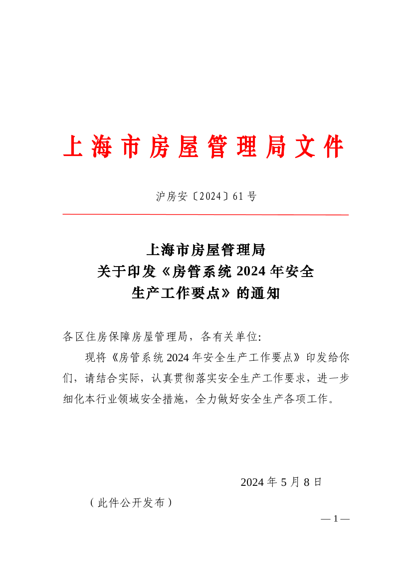 上海市房屋管理局关于印发《房管系统2024年安全生产工作要点》的通知