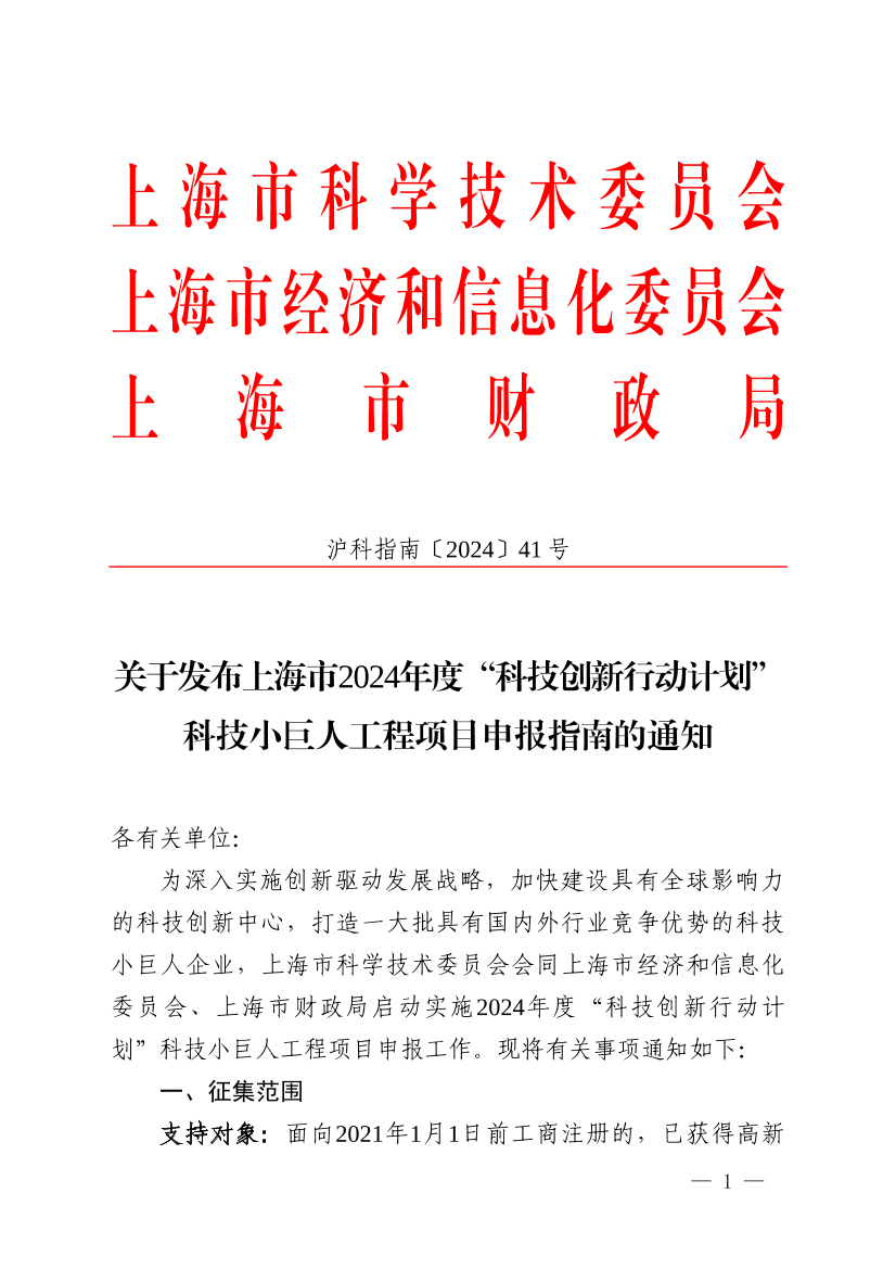 为深入实施创新驱动发展战略,加快建设具有全球影响力的科技创新中心,打造一大批具有国内外行业竞争优势的科技小巨人企业,上海市科学技术委员会会同上海市经济和信息化委员会、上海市财政局启动实施2024年度“科技创新行动计划”科技小巨人工程项目申报工作。现将有关事项通知如下: