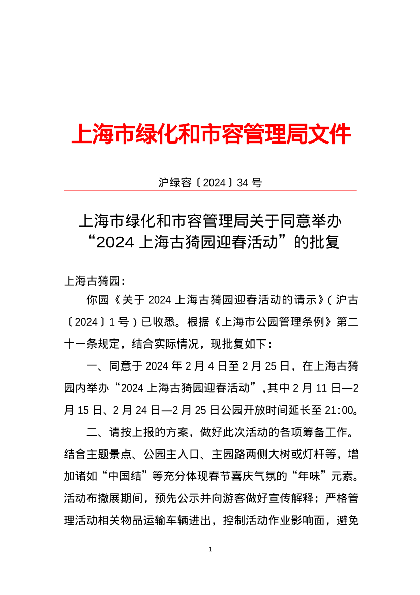 一、同意于 2024年 2月 4 日至 2月 25 日,在上海古猗园内举办“2024上海古猗园迎春活动”,其中 2月 11 日—2月 15 日、2月 24 日—2月 25 日公园开放时间延长至 21:00。