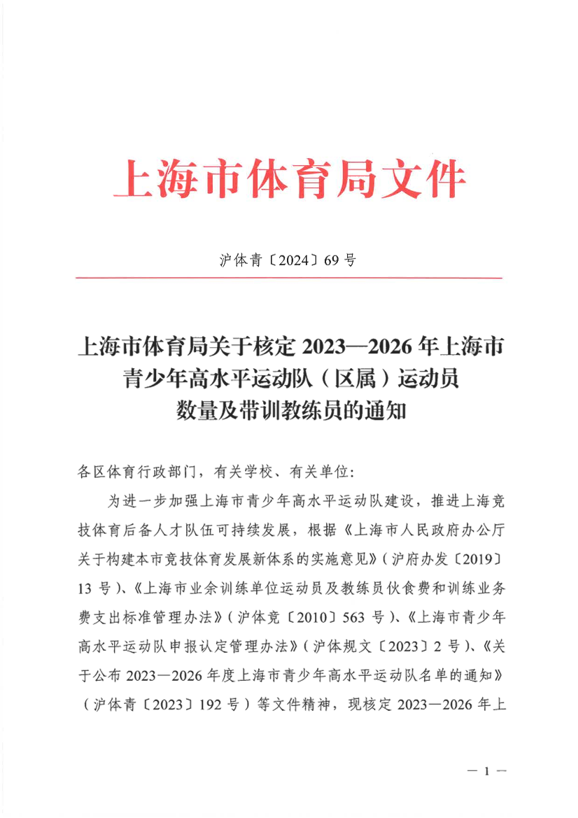 为进一步加强上海市青少年高水平运动队建设,推进上海竞技体育后备人才队伍可持续发展,根据《上海市人民政府办公厅关于构建本市竞技体育发展新体系的实施意见》(沪府办发〔2019〕13号)、《上海市业余训练单位运动员及教练员伙食费和训练业务费支出标准管理办法》(沪体竞〔2010〕563号)、《上海市青少年高水平运动队申报认定管理办法》(沪体规文〔2023〕2号)、《关于公布2023—2026年度上海市青少年高水平运动队名单的通知》(沪体青〔2023〕192号)等文件精神,现核定2023—2026年上海市青少年高水平运动队(区属)运动员数量及带训教练员名单(详见附件)。