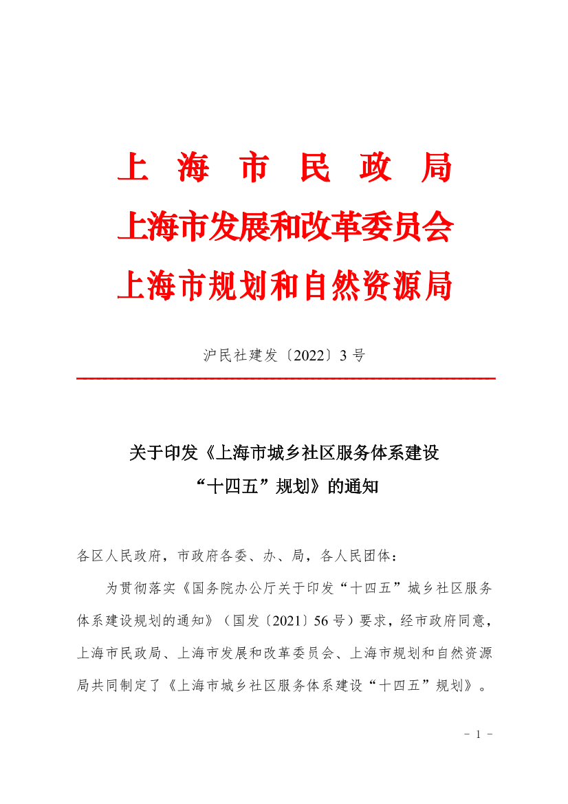 为贯彻落实《国务院办公厅关于印发“十四五”城乡社区服务体系建设规划的通知》(国发〔2021〕56号)要求,经市政府同意,上海市民政局、上海市发展和改革委员会、上海市规划和自然资源局共同制定了《上海市城乡社区服务体系建设“十四五”规划》。现将《规划》印发给你们,请认真贯彻落实。