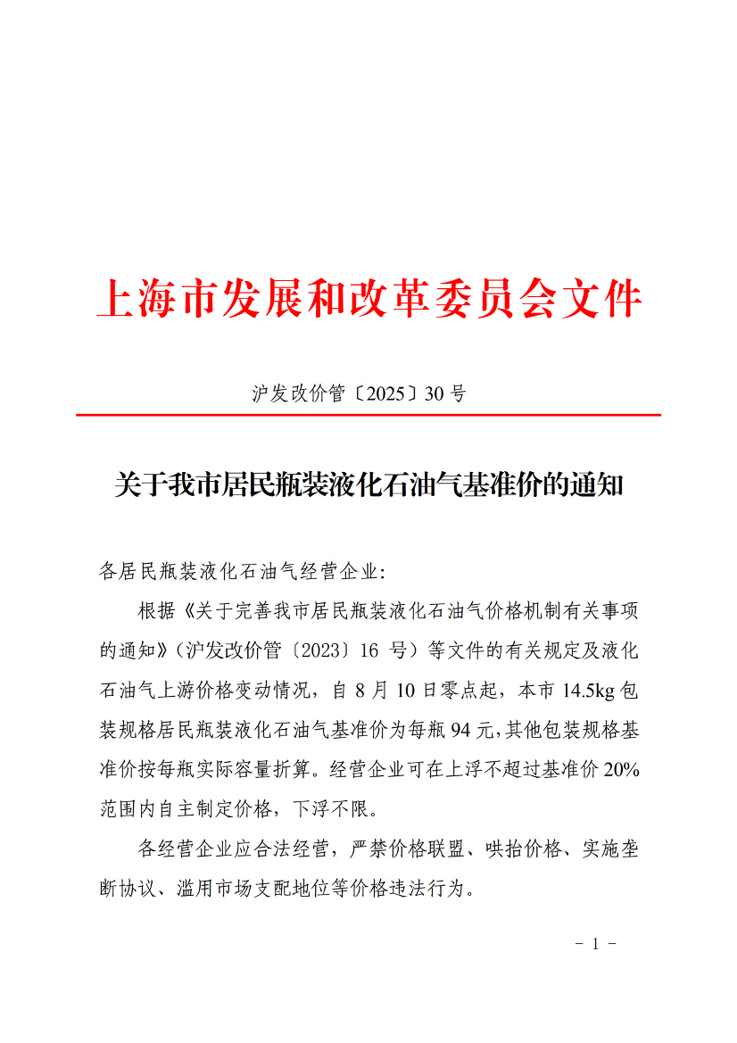 根据《关于完善我市居民瓶装液化石油气价格机制有关事项的通知》(沪发改价管〔2023〕16号)等文件的有关规定及液化石油气上游价格变动情况,自8月10日零点起,本市14.5kg包装规格居民瓶装液化石油气基准价为每瓶94元,其他包装规格基准价按每瓶实际容量折算。经营企业可在上浮不超过基准价20%范围内自主制定价格,下浮不限。