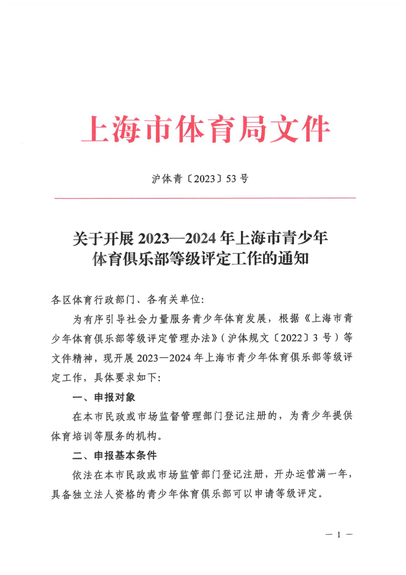 为有序引导社会力量服务青少年体育发展,根据《上海市青少年体育俱乐部等级评定管理办法》(沪体规文〔2022〕3号)等文件精神,现开展2023—2024年上海市青少年体育俱乐部等级评定工作,具体要求如下: