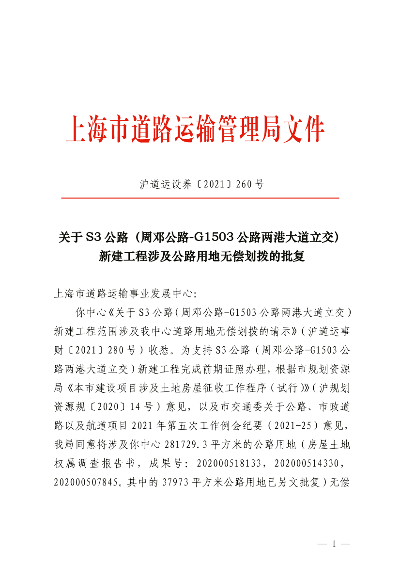 你中心《关于S3公路(周邓公路-G1503公路两港大道立交)新建工程范围涉及我中心道路用地无偿划拨的请示》(沪道运事财〔2021〕280号)收悉。为支持S3公路(周邓公路-G1503公路两港大道立交)新建工程完成前期证照办理,根据市规划资源局《本市建设项目涉及土地房屋征收工作程序(试行)》(沪规划资源规〔2020〕14号)意见,以及市交通委关于公路、市政道路以及航道项目2021年第五次工作例会纪要(2021-25)意见,我局同意将涉及你中心281729.3平方米的公路用地(房屋土地权属调查报告书,成果号:202000518133,202000514330,202000507845。其中的37973平方米公路用地已另文批复)无偿划拨给上海沪洋高速公路建设发展有限公司(项目建设单位)作为建设道路使用。