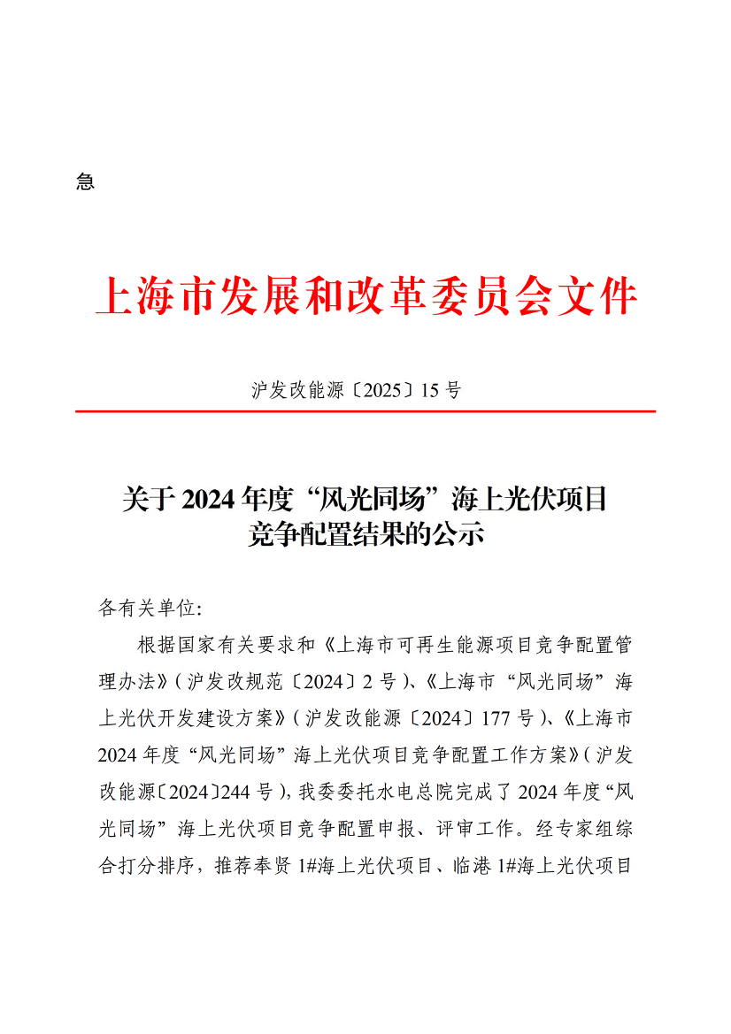 根据国家有关要求和《上海市可再生能源项目竞争配置管理办法》(沪发改规范〔2024〕2号)、《上海市“风光同场”海上光伏开发建设方案》(沪发改能源〔2024〕177号)、《上海市2024年度“风光同场”海上光伏项目竞争配置工作方案》(沪发改能源〔2024〕244号),我委委托水电总院完成了2024年度“风光同场”海上光伏项目竞争配置申报、评审工作。经专家组综合打分排序,推荐奉贤1#海上光伏项目、临港1#海上光伏项目作为我市第一批海上光伏试点。