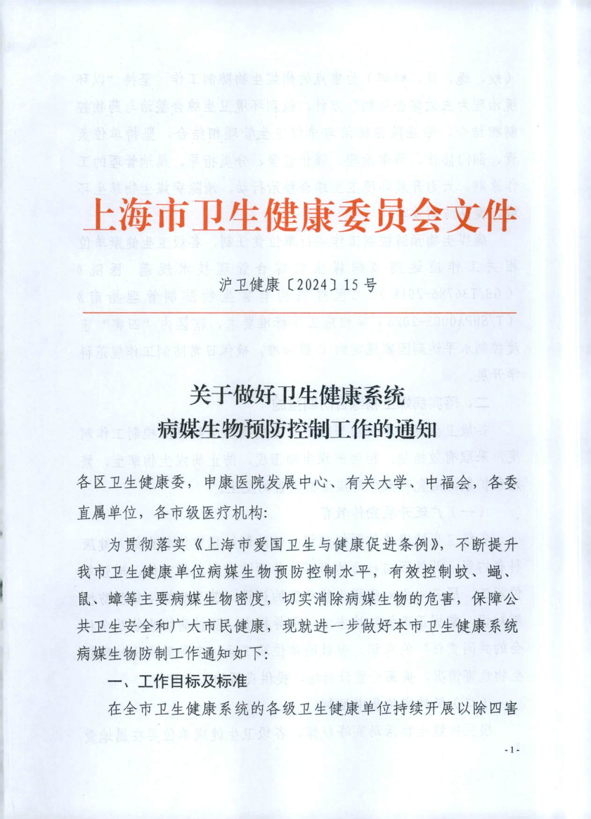 为贯彻落实《上海市爱国卫生与健康促进条例》,不断提升我市卫生健康单位病媒生物预防控制水平,有效控制蚊、蝇、鼠、蟑等主要病媒生物密度,切实消除病媒生物的危害,保障公共卫生安全和广大市民健康,现就进一步做好本市卫生健康系统病媒生物防制工作通知如下: