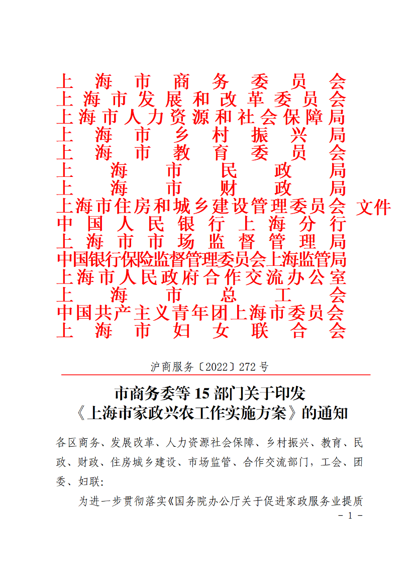 为进一步贯彻落实《国务院办公厅关于促进家政服务业提质扩容的意见》(国办发〔2019〕30号)、《家政兴农行动计划(2021-2025年)》(商服贸函〔2021〕512号)等文件要求,扎实做好本市家政兴农工作,促进家政服务业提质扩容,市商务委等15部门特制订了《上海市家政兴农工作实施方案》。现印发给你们,请遵照执行。