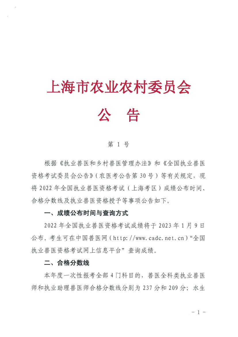 根据《执业兽医和乡村兽医管理办法》和《全国执业兽医资格考试委员会公告》(农医考公告第30号)等有关规定,现将2022年全国执业兽医资格考试(上海考区)成绩公布时间、合格分数线及执业兽医资格授予等事项公告如下。