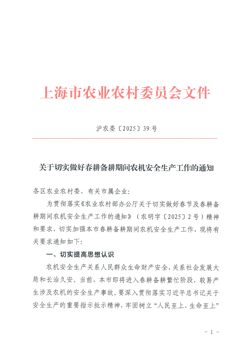 为贯彻落实《农业农村部办公厅关于切实做好春节及春耕备耕期间农机安全生产工作的通知》(农明字〔2025〕2号)精神和要求,切实加强本市春耕备耕期间农机安全生产工作,现将有关要求通知如下: