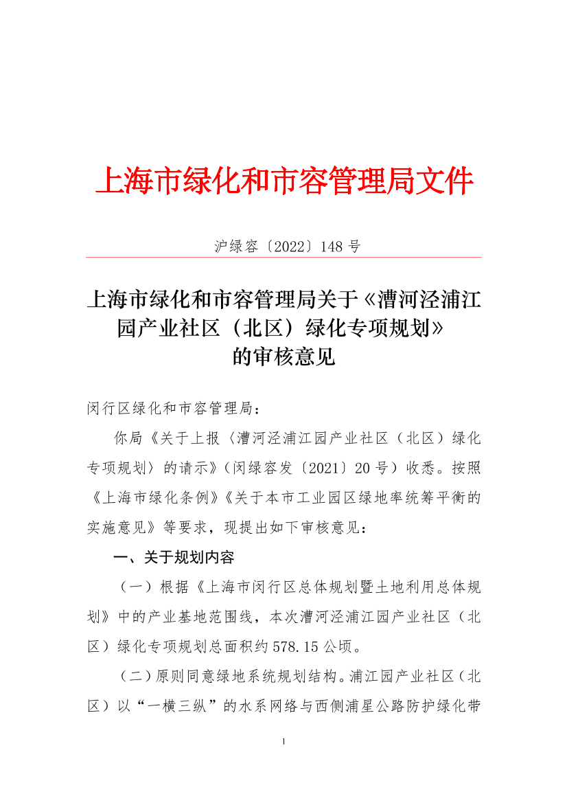 你局《关于上报〈漕河泾浦江园产业社区(北区)绿化专项规划〉的请示》(闵绿容发〔2021〕20号)收悉。按照《上海市绿化条例》《关于本市工业园区绿地率统筹平衡的实施意见》等要求,现提出如下审核意见: